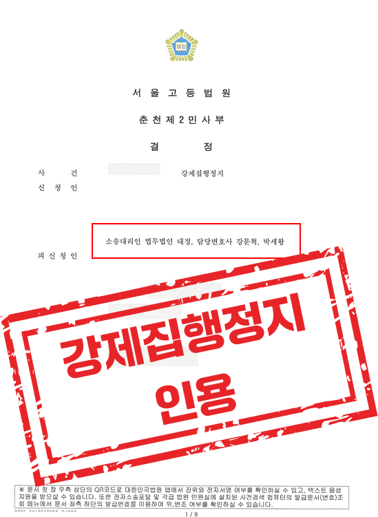 ▶ 서울고등법원으로부터 항소심 판결 시까지 강제집행을 정지한다는 결정을 받아내어 의뢰인의 소중한 자산을 안전하게 보호.