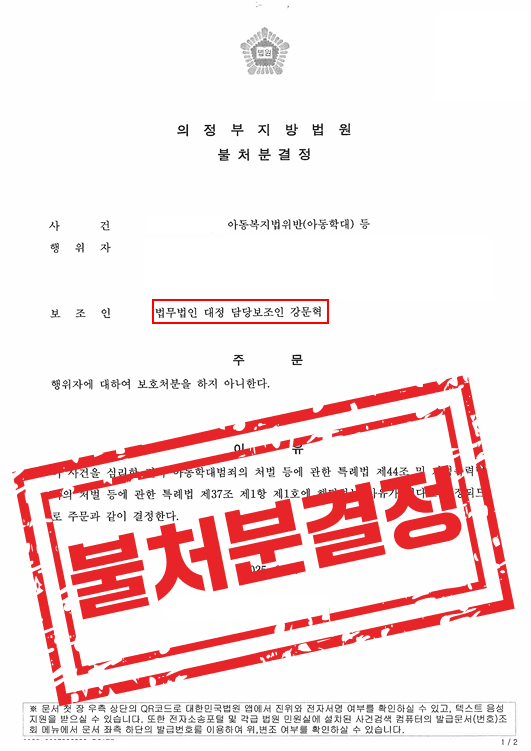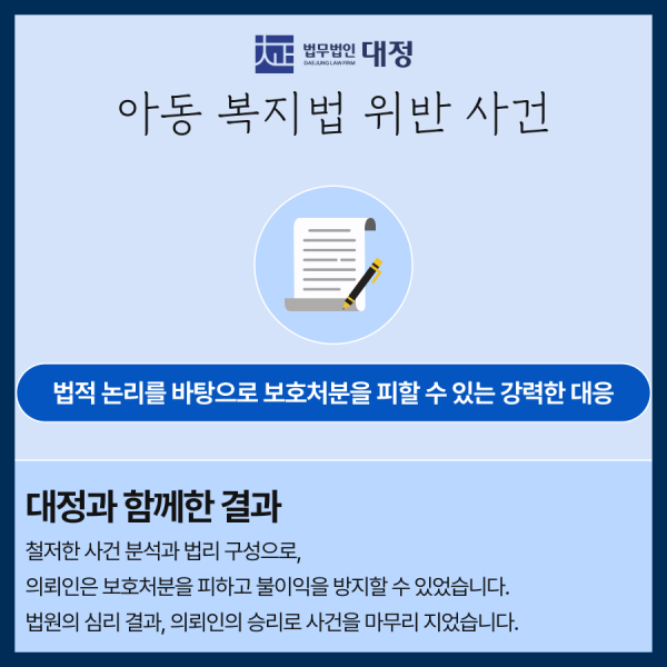 [형사] 아동복지법 위반 사건, 보호처분 미적용 결정 성공 26-04-28 목록 LAW FIRM 사건의 개요 [의뢰인]의뢰인은 억울하게 아동학대 혐의를 받고 있었으며, 보호처분이 내려질 수 있는 상황에서 법적 대응이 절실하여 저희 법무법인 대정을 찾아주셨습니다. [구체적 개요]■사건의 발단의뢰인은 억울하게 아동학대범죄에 휘말려 관련된 법적 절차가 진행되었고, 보호처분이 내려질 수 있는 상황이었습니다. ■위기 상황 보호처분이 내려지면 의뢰인에게 큰 불이익이 발생할 수 있어 빠른 법적 대응이 필요했습니다. LAW FIRM 법무법인 대정의 조력 법적 근거와 특례법 적용을 분석하여 사건의 핵심을 명확히 설명함.피해 아동과 행위자 행동을 구분해 보호처분 부당성을 강조함.증거와 증언 정리로 행위자의 의도를 입증하고 불리한 판단을 피함. LAW FIRM사건의 결과 [핵심 판결 내용]① 법원은 아동학대 행위자에 대해 보호처분을 내리지 않기로 결정하였다.② 아동학대 혐의에 대한 억울함을 입증하며, 법원은 피고인의 결백을 인정하였다③ 피고인의 가정적 상황과 아동학대 사건에 대한 반성을 고려하여, 보호처분이 필요 없다고 판단하였다.▶ 강문혁 대표 변호사의 전략 승리 LAW FIRM 사건의 의의 [강문혁 변호사의 핵심 요약]▶ 아동학대 사건에서 피해 아동의 심리적 피해를 최소화하고, 피고인의 반성을 최대한 강조함.▶ 억울한 혐의를 입증하기 위해 신속히 대응하며, 피고인에게 유리한 증거를 충분히 확보함.▶ 형사처벌을 피하고, 최종적으로 보호처분을 하지 않기로 결정됨.강문혁 변호사 1:1 상담아래 편한 방법으로 시작하세요▼ LAW FIRM 판결문 목록