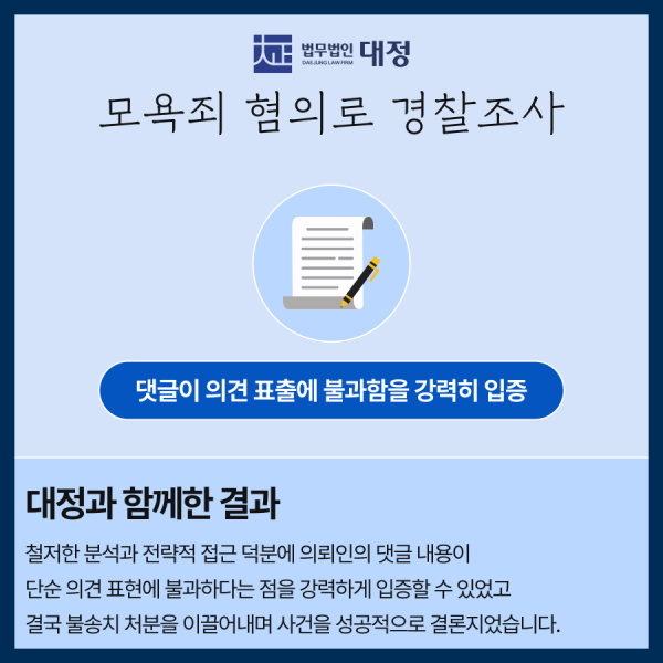 의뢰인은 특정 기사에 대해 댓글을 작성하며, 고소인에게 모욕적인 표현을 사용했다는 혐의를 받게 되었고, 이에 대해 법적 대응을 위해 저희 법무법인 대정을 찾아주셨습니다. |