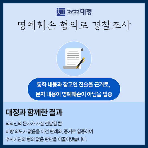 의뢰인은 직장 동료에게 보낸 문자메시지 때문에 명예훼손 혐의를 받게 되었고, 이에 대한 법적 대응을 위해 저희 법무법인 대정을 찾아주셨습니다. |