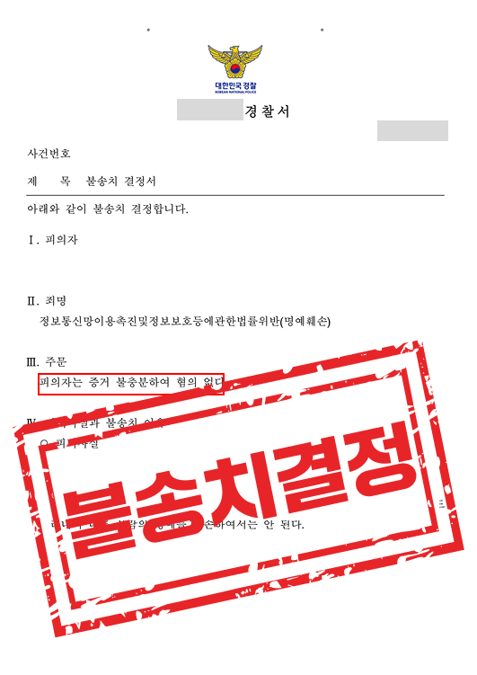 [형사] 정보통신망 명예훼손 혐의, "혐의 없음" 불송치 결정!