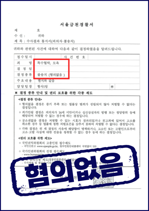 그 결과 경찰에서 신속하게 혐의 없음 불송치 결정을 받아낼 수 있었습니다.