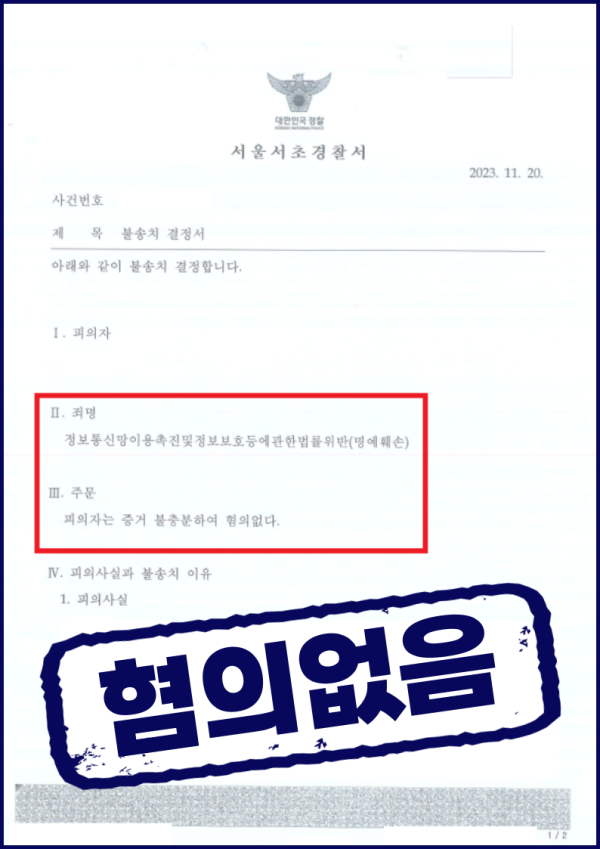 90만 유튜버 'ㅇㅇ' 고소사건 전부방어 / 명예훼손 / 혐의없음