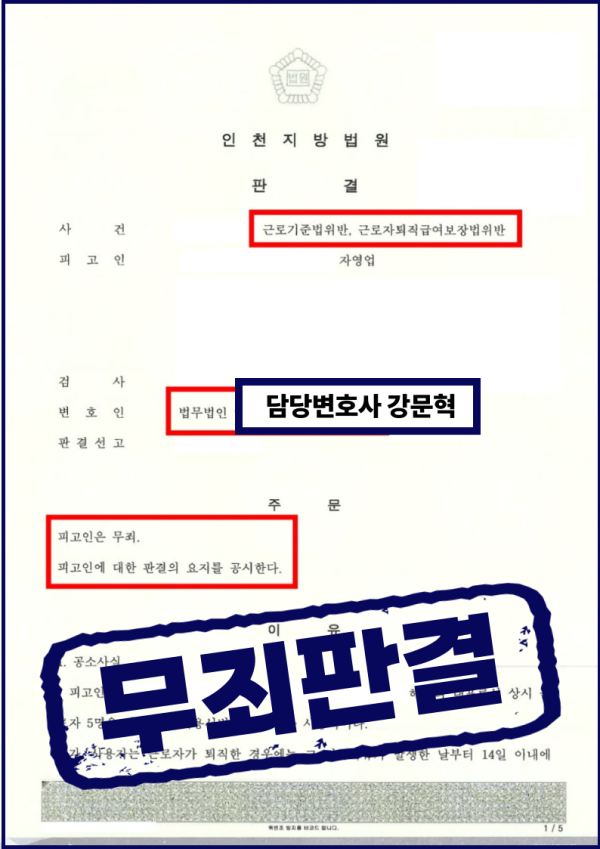 결국 재판부는 근로자성이 인정되지 않는다는 변호인의 주장을 받아들여 의뢰인에게 무죄를 선고하였습니다.