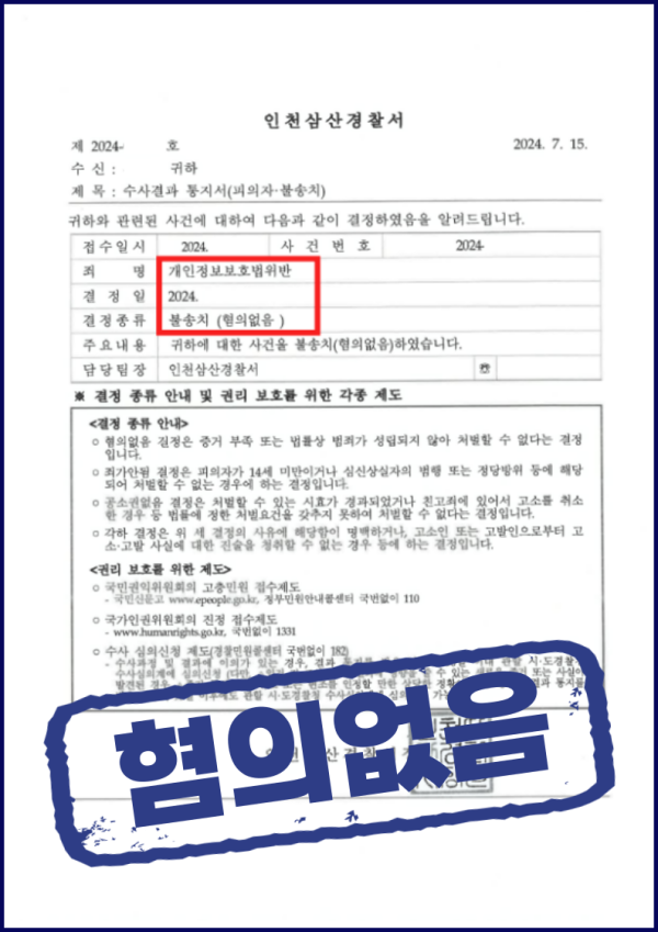 고소사건 전부방어 / 개인정보보호법위반 / 불송치(혐의없음)